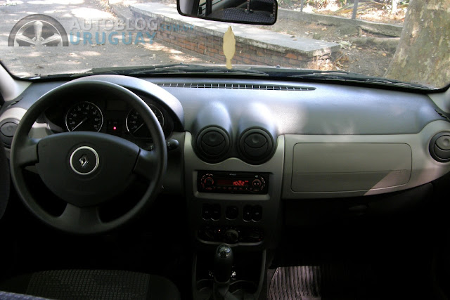 El tablero de instrumentos ofrece buena lectura con dos instrumentos de aguja grandes. Encontramos al velocímetro y al tacómetro que no marca la escala roja. Todo el conjunto instrumental tiene un diseño simple. En el medio del tablero encontramos un medidor digital de combustible y de temperatura del agua del motor, ambos poco precisos. También ahí se puede visualizar los odómetros total/parcial. El volante de grip agradable, en plástico y uno de los dos airbags. Los comandos de limpiaparabrisas y luces están detrás del volante. Como todos los Renault, el comando de radio está a la derecha, por detrás del volante. El comando de la bocina está en el volante y ante cualquier manotazo suena.