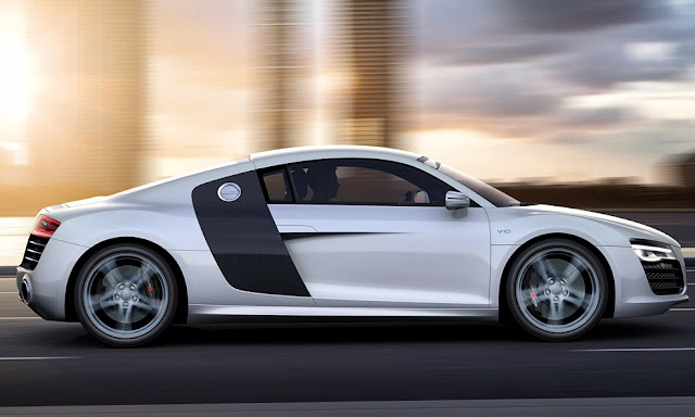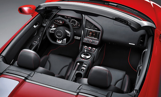 Adicionalmente, el R8 suma una versión tope de gama, llamada V10 Plus, que descibiré más adelante en detalle. El último de los cambios externos viene por un nuevo juego de llantas, que en el caso del V8 son de 18 pulgadas, mientras que en el V10 crecen a 19 pulgadas. Para los que quieran divertirse en los configuradores on line, si es que no tienen el dinero para uno, Audi ofrecerá once colores de carrocería entre texturas sólidas, metalizadas y perladas, además de uno mate, específico para el V10 Plus. que se combinarán con las "side blades" en ocho tonos diferentes y si optan por el Spyder, el techo podrá ser negro, rojo o marrón.