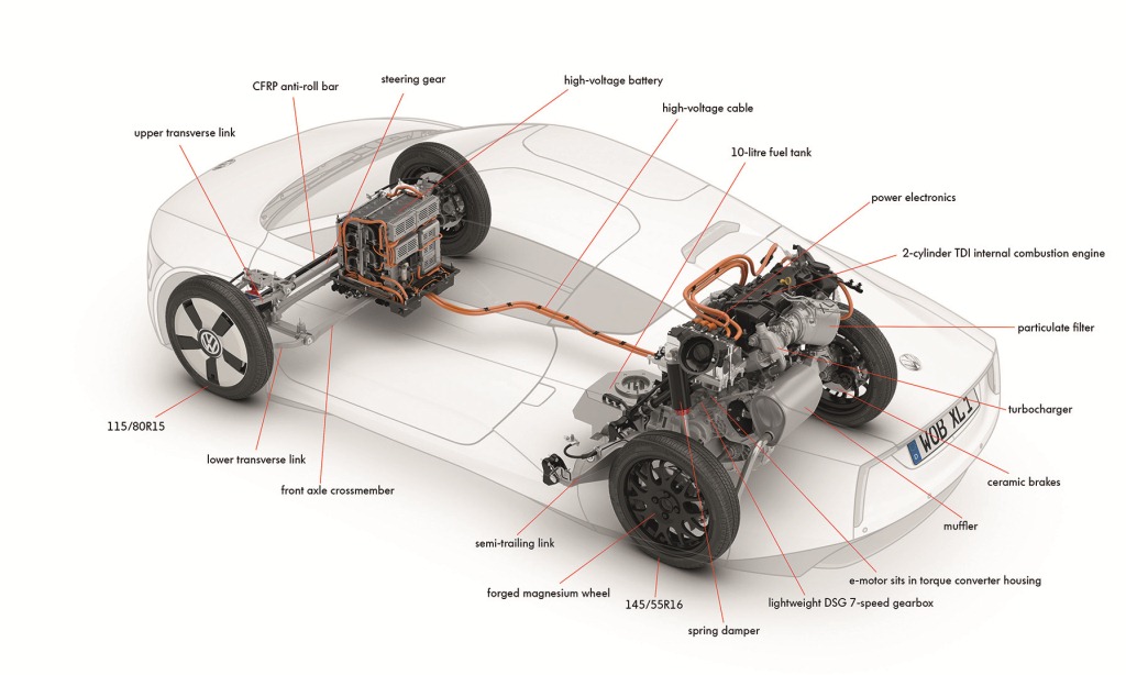 El XL1 es un híbrido que se vale de un motor 0.8 TDI bicilíndrico con 48 cv y otro motor eléctrico de 27 cv de potencia. Estos impulsores van situados por detrás de los ocupantes en posición central, en tanto que la tracción es trasera. Ambos van acoplados a una transmisión automática DSG de siete marchas y embragues separados, para que el motor eléctrico pueda funcionar independientemente del impulsor a combustión. Cuando funcionan en conjunto, producen 69 cv de potencia y 140 Nm de par.