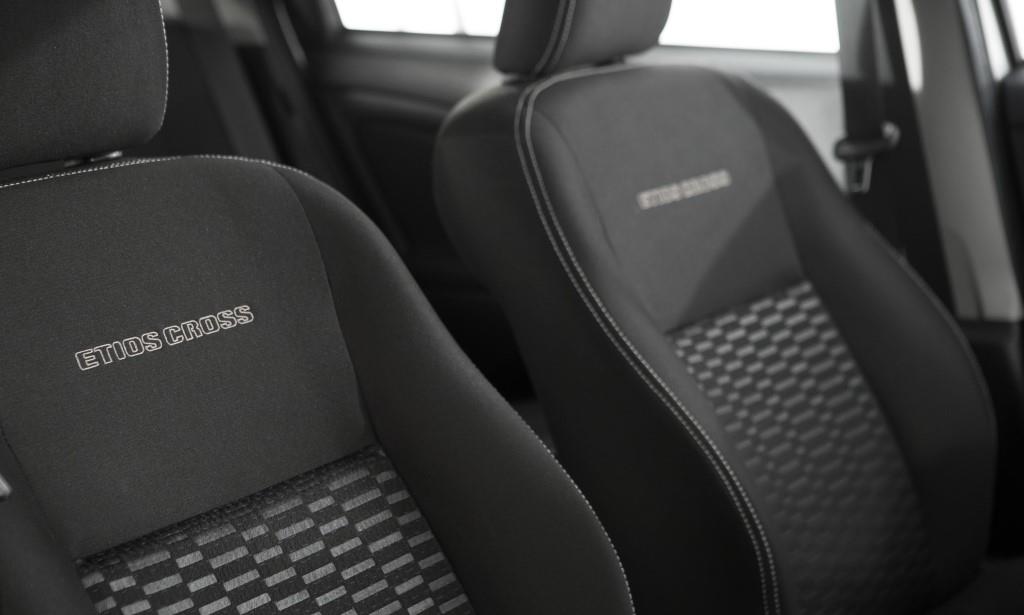 A diferencia de algunos rivales del Etios Cross (Sandero Stepway, CrossFox, HB20X, etc.) el producto de Toyota mantiene un habitáculo bastante similar a la variante tradicional, solo utilizando un tapizado exclusivo, con el nombre de la versión estampado en los respaldos de los asientos delanteros. En cuanto a opciones de colores, hay seis opciones: blanco, negro, gris oscuro, azul, gris plata, rojo y amarillo.